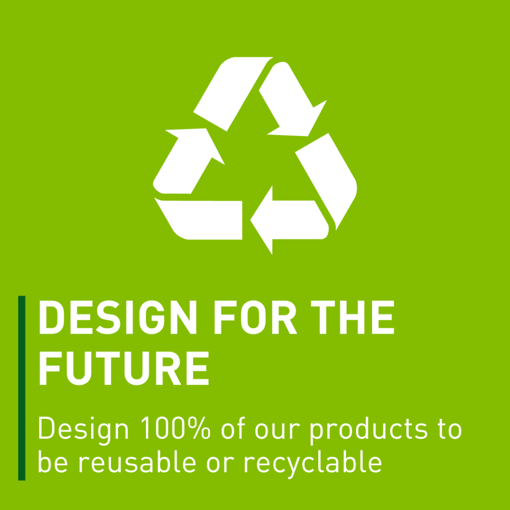 - Design for the Future: We are committed to designing 100% of our products to be reusable or recyclable by 2030.